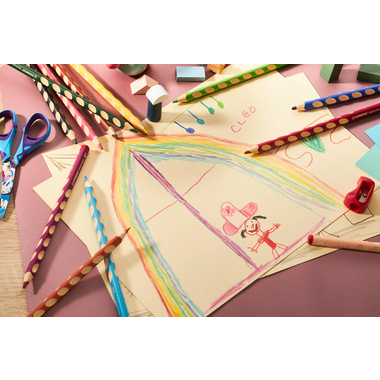 Ergonomischer Dreikant-Buntstift für Vorschulkinder und Schüler ab 5 Jahren. Erster ergonomischer Buntstift speziell für Links- und Rechtshänder. Dreikantform und rutschfeste Griffmulden sorgen für eine entspannte Handhaltung. Gelber oder roter Farbcode am Stiftende signalisiert linke bzw. rechte Ausführung. Brillante Farben in Holz aus nachhaltiger Waldwirtschaft. Jeder Stift mit Namensfeld.
